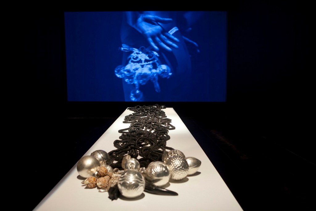 Materiais: Vídeo, pastilhas de coco ebanizadas, cobre e prata